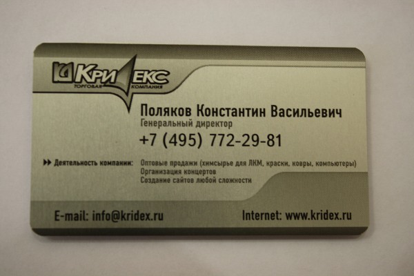 Визитная карточка - это небольшой, но удобный носитель важной информации о вас и вашей фирме. Визитные карточки, как правило, изготавливаются из плотной бумаги. Но в определённых случаях лучше отойти от общего правила. И сделать особенную визитку. Выглядеть она будет классически, но вместо бумаги будет другой материал. Можете и не обратить внимания, но подсознательно эти элементы оказывают влияние на вашу оценку партнёра и создают общее впечатление. Как говорится, встречают по одёжке. И визитная карточка один из таких элементов. После встречи вы расстанетесь, забудутся детали, а визитная карточка останется. Визитка - это не просто приятная мелочь, существенно экономящая время при знакомстве, это своего рода "лицо" компании и её представителей. Изготовление визиток для наших дизайнеров хорошо знакомое дело. Они с удовольствием спроектируют для вас креативные визитки. Размер визитки стандартный, но вы, разумеется, можете заказать любой.