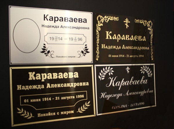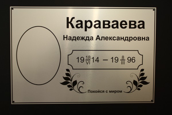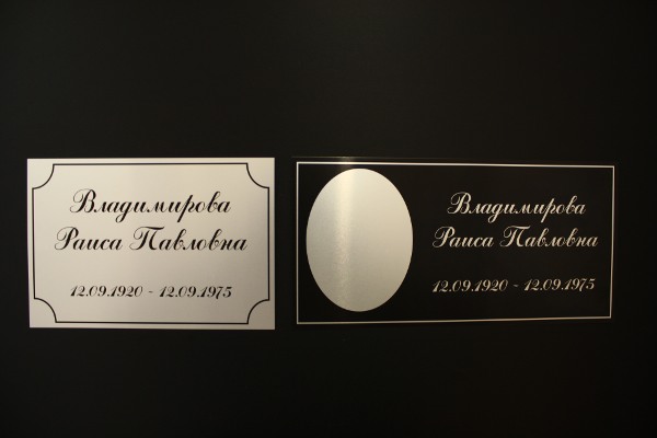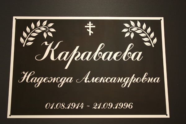 Изготовление ритуальных табличек основано на технологии нанесения изображения на алюминиевые пластины. Изображение на этих пластинах внедряется вглубь металла. Это и обеспечивает феноменальную долговечность наших изделий. На табличках Вы можете заказать не только надписи. Можно разместить любые изображения фотографической четкости. Цена таблички зависит только от её площади. Наши ритуальные таблички самоклеящиеся. Клейкая основа от компании 3М. Надёжно держится при любых климатических условиях. Просто просчитайте экономию еще до того, как вы собрались установить памятник. Мы не призываем экономить на памяти о дорогих для вас людях, но и переплачивать не стоит. Изготовление ритуальных табличек основано на технологии нанесения изображения на алюминиевые пластины. Изображение на этих пластинах внедряется вглубь металла. Это и обеспечивает феноменальную долговечность этих изделий. На табличках вы можете сделать не только надписи. Можно разместить любые изображения с фотографическим качеством. Цена таблички зависит только от её площади.